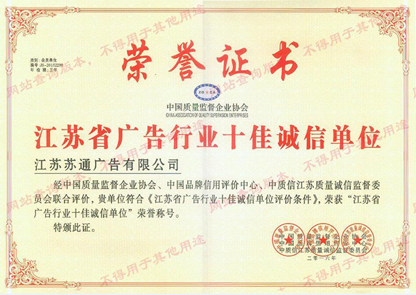由中国质量监督企业协会、中国品牌信誉评价中心、中质信江苏质量诚信监督委员会对江苏省企业的诚信建设和品牌塑造进行评估和考察,通过综合评分和数据的评估,评选出江苏十佳诚信品牌企业,在江苏省多家知名企业的竞争中,我们苏通广告有限公司脱颖而出,最终成功当选为“江苏省广告行业十佳诚信单位”,以下是我公司当选的证书: